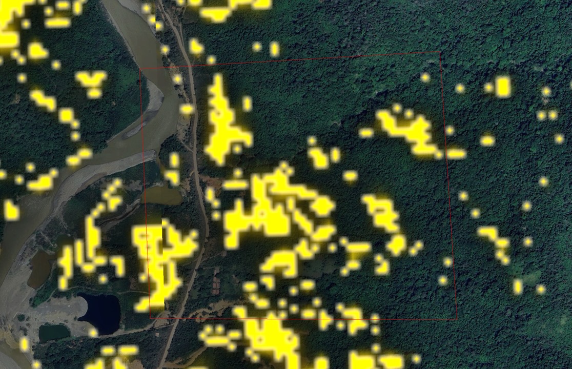 - Mining site overview — Bolivia concession — Aerial view of GOLDN mining concession in La Paz Department, Bolivia showing active placer mining operations.